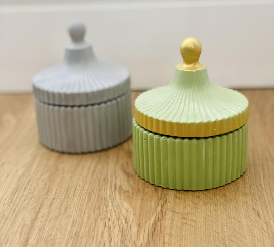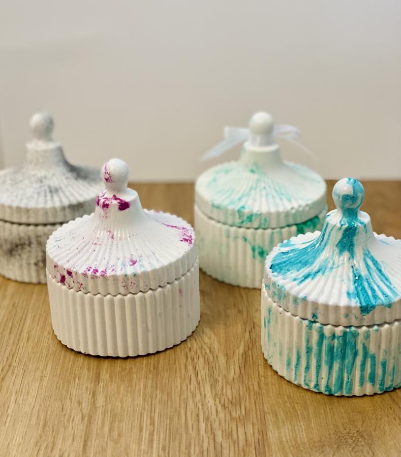 Alhajero/caramelera modelo circus: Estilo moderno. Base circular con tapa, elegante y da protagonismo a tus velas, difusores o floreros. Belleza funcional. Material: Yeso y cemento. Medidas: Diámetro 8 cm x Alto 3.5 cm. Sellada y Barnizada