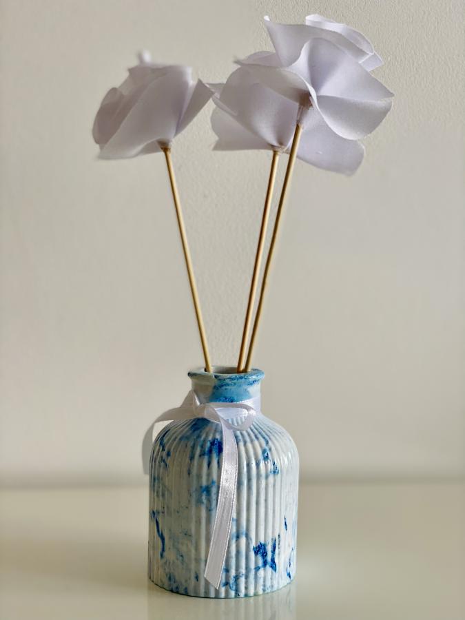 Florero Vibrante Nuevo Comienzo. Estallido de energía positiva con acabado de color dinámico. Ideal para decorar cualquier ambiente. Material: Yeso y cemento. Medidas: Alto 9 cm x Diámetro 6.8 cm. (No apto para agua). Sellada y Barnizada.