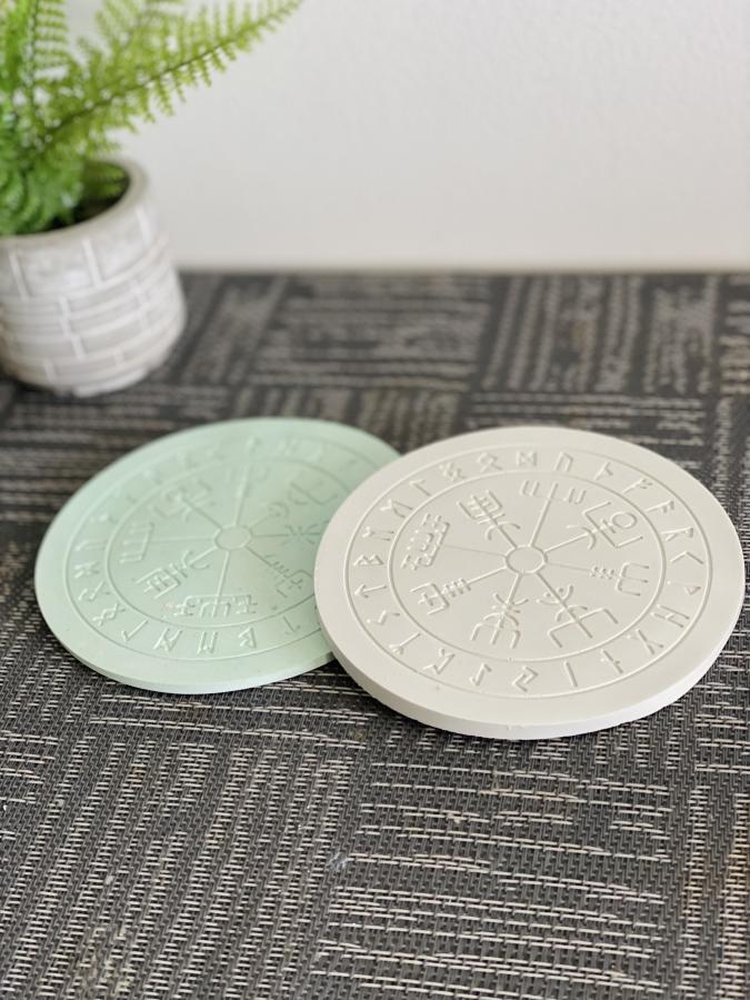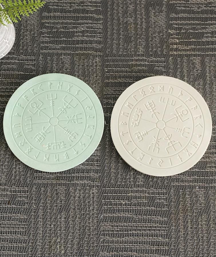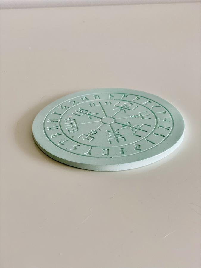 Bandeja Círculo nórdica. Equilibrio y funcionalidad. Perfecta para apoyar tus velas o articulos personales. Con diseño nórdico tipo vikinga. Material: Yeso y cemento. Medidas: Diámetro 11 cm x Alto 0.4 cm. Sellada y Barnizada.