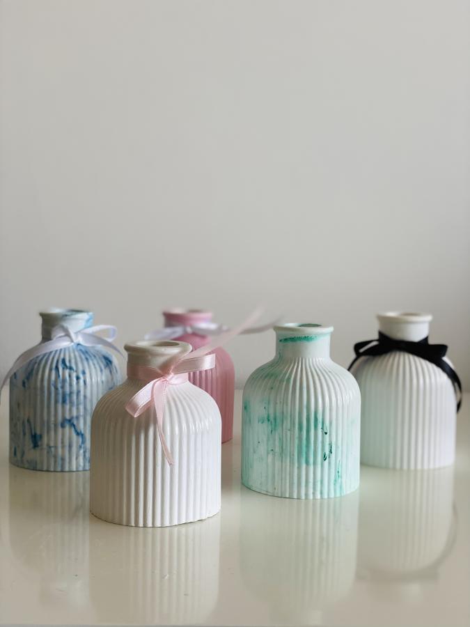 Florero Vibrante Nuevo Comienzo. Estallido de energía positiva con acabado de color dinámico. Ideal para decorar cualquier ambiente. Material: Yeso y cemento. Medidas: Alto 9 cm x Diámetro 6.8 cm. (No apto para agua). Sellada y Barnizada.
