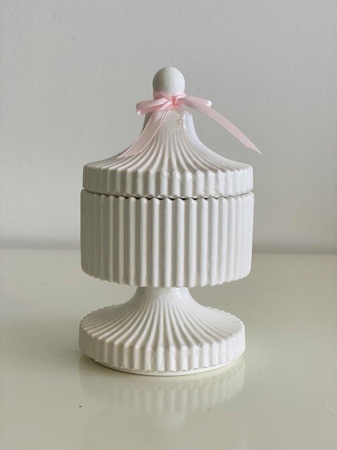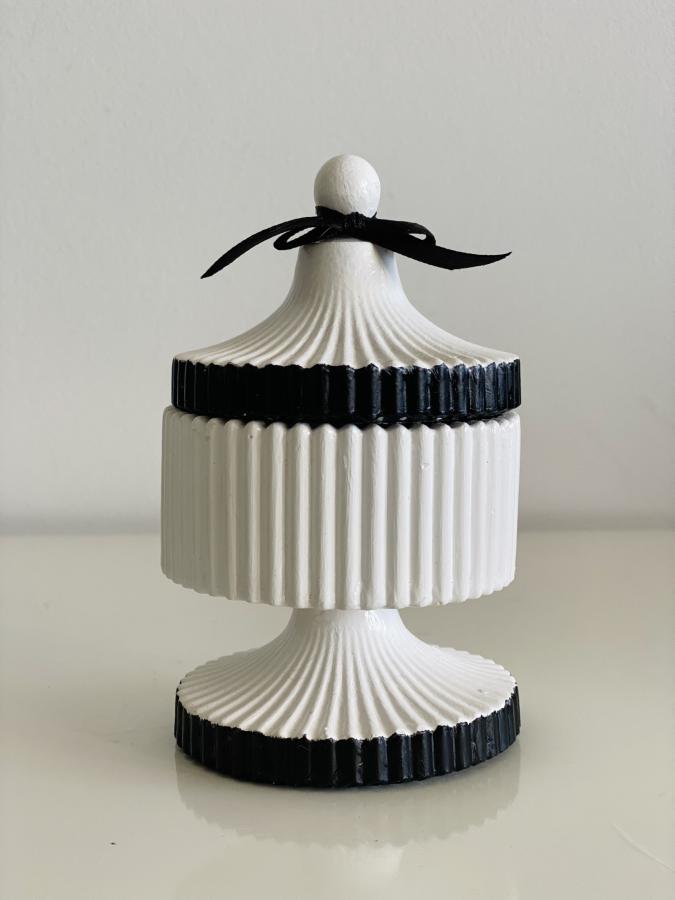 Alhajero Copa. Sofisticado contenedor de diseño único, perfecto para guardar tus joyas más preciadas o esenciales de tocador. Aporta una elegancia atemporal a tu espacio. Material: Yeso y cemento sellado. Medidas: Diámetro 7.5cm x 14cm alto