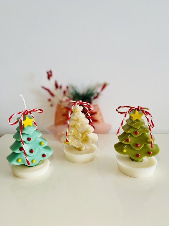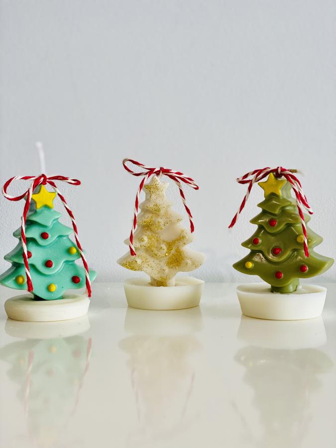 Vela Árbol de Navidad con base. Vela de molde para colgar o decorar. Árbol que simboliza la unión familiar, llenando tu hogar de magia navideña. Material: Cera de soja. Medidas: Alto 9 cm x Ancho 6 cm x Profundidad 5.5 cm