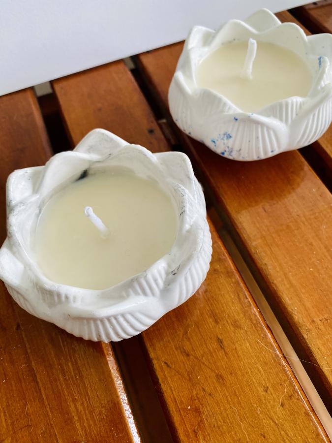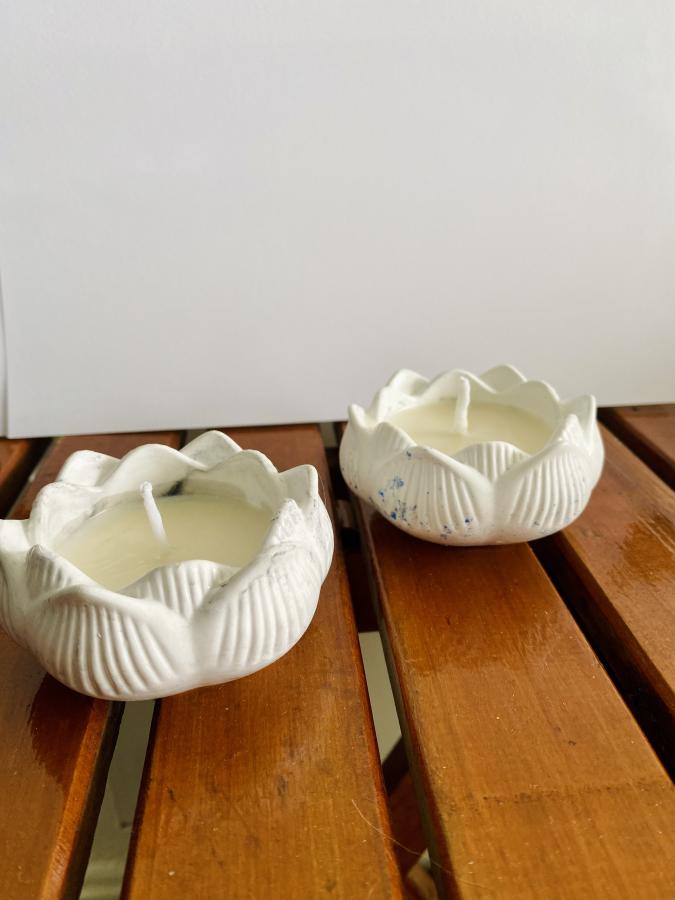 Vela Flor de Loto. Símbolo de pureza. El recipiente de yeso y cemento contiene cera de soja, ideal para relajación e iluminar tu ambiente. Material: Yeso y Cera de soja. Medidas: Diámetro 7.5 cm x Alto 4cm.