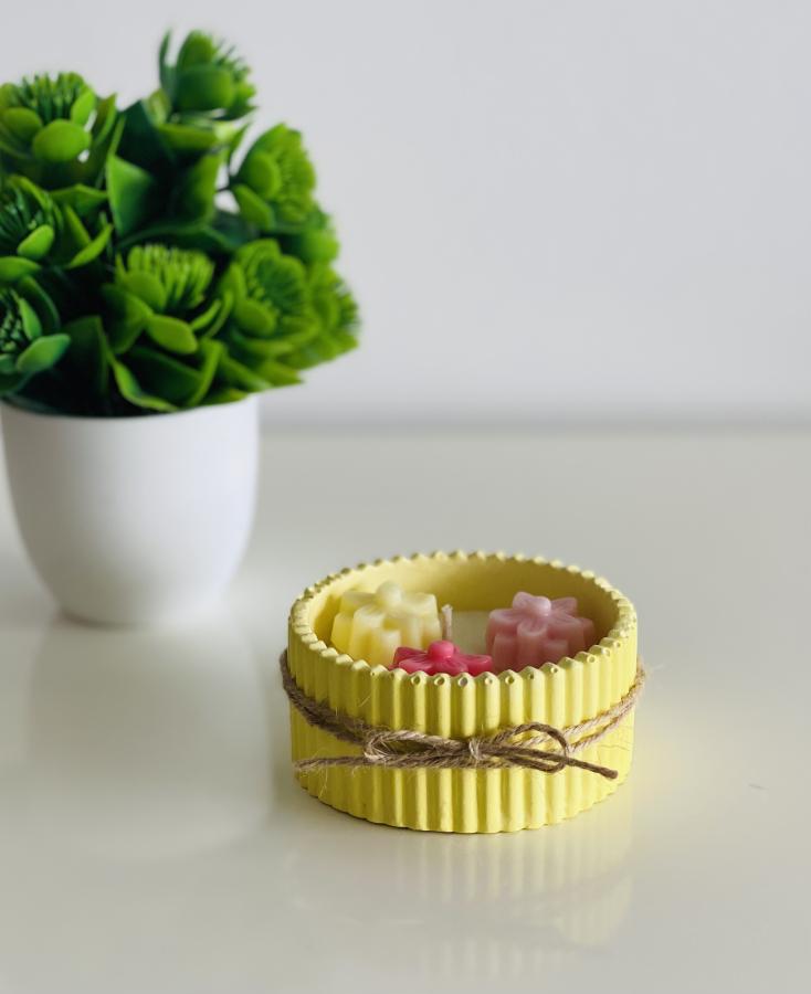 Set Circus + Vela Floral. Base de yeso y cemento elegante con una vela y decoración de pequeñas flores de cera. Decoración sofisticada para cualquier rincón. Material: Yeso/Cemento y Cera de soja. Medidas: Base 10 cm x Alto 5cm.