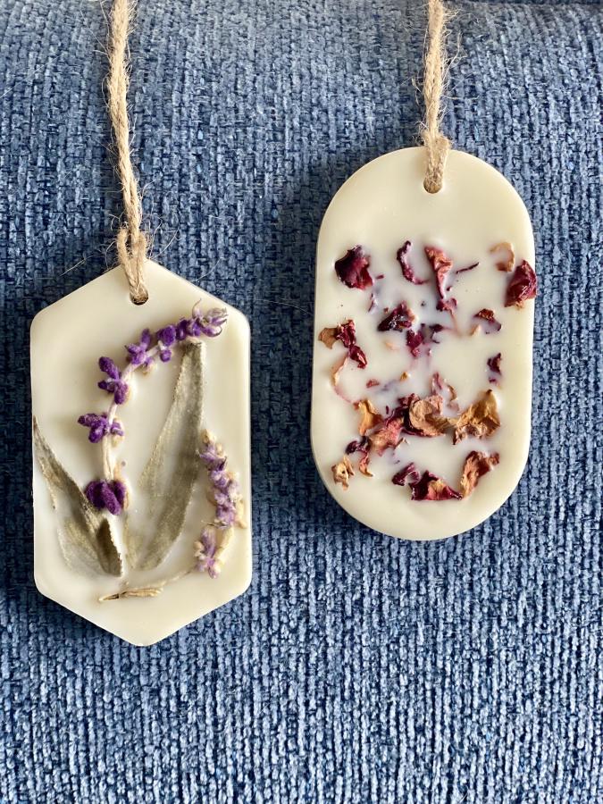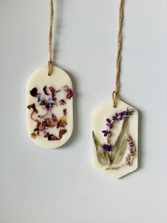 Ambientador de cera de soja decorado con hojas secas naturales. Ideal para armarios; ofrece un aroma sutil y duradero. Sin llama. Material: Cera de soja. Medidas: Alto 9.5 cm x Ancho 5.5 cm x 0.5 grosor.