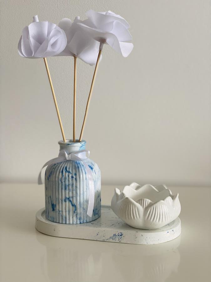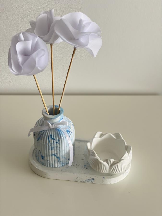 Combinación elegante: Bandeja ovalada, Florero con flores de tela y recipiente Flor de Loto. Crea un rincón de inspiración y paz. Material: Yeso, Cemento y Tela. Medidas: Referencia Bandeja 18 cm.