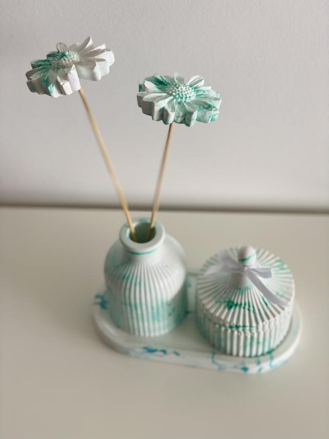Bandeja ovalada, Florero con flores de yeso y Circus sin vela. Solución completa para un escritorio o tocador chic. Material: Yeso y Cemento. Medidas: Recipiente Bandeja 18 cm.