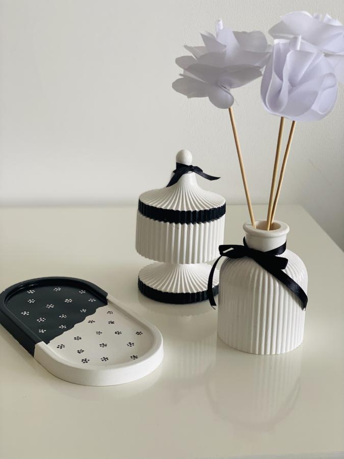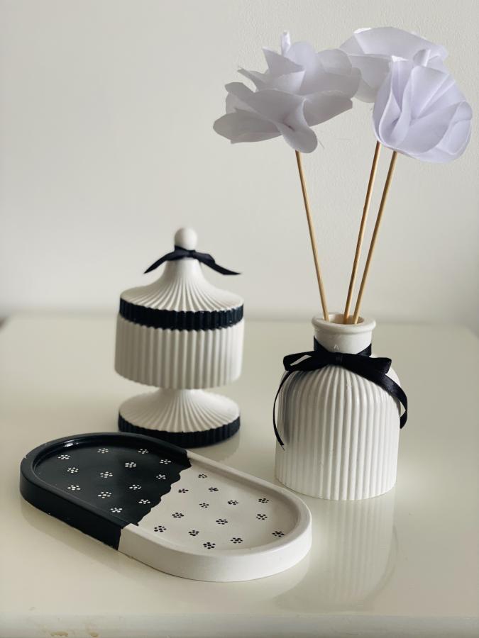 Bandeja ovalada, Alhajero Copa sin vela, Florero con Flores de tela. El trío sofisticado de yeso y cemento que transforma tu tocador en algo muy especial. Solución de decoración completa y elegante. Material: Yeso, Cemento