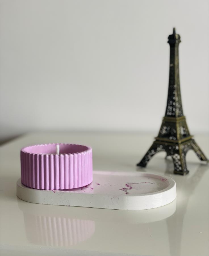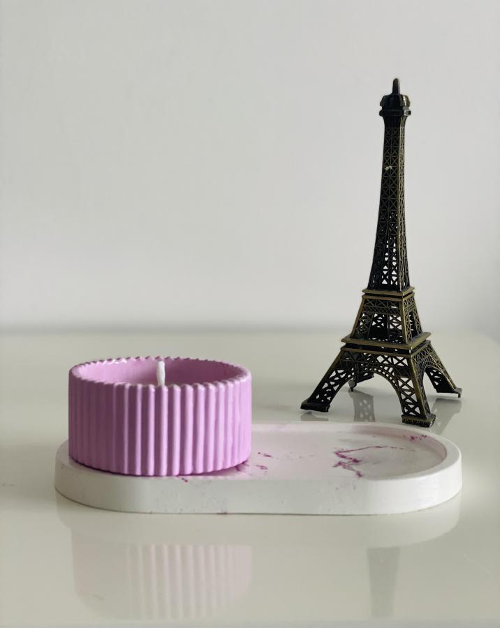 Bandeja ovalada y base Circus con vela. La combinación más limpia y minimalista para tu hogar. Material: Yeso/Cemento y Cera de soja. Medidas: Bandeja 18 cm.