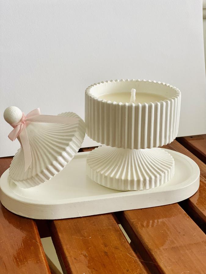 Bandeja ovalada y Alhajero Copa Circus con vela. La combinación más sofisticada, ¡el alhajero se reutiliza! Material: Yeso/Cemento y Cera de soja. Medidas: Bandeja 18 cm.
