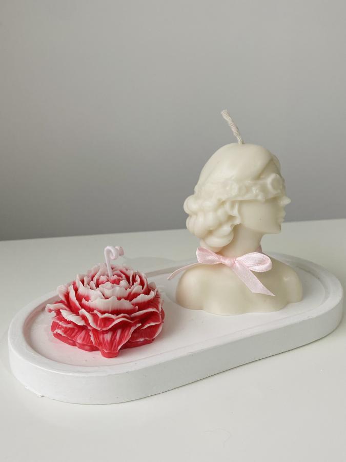 Bandeja con vela flor peonia y vela de diseño mujer con antifaz. Material: Yeso, cemento y cera de soja. Un toque de sofisticación para cualquier rincón