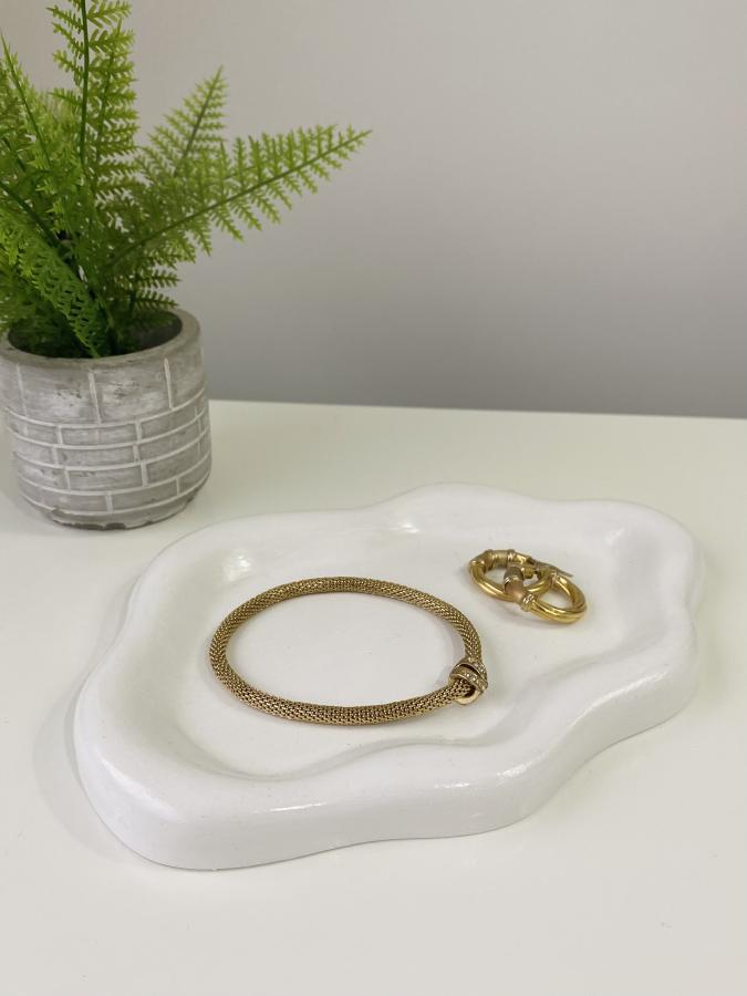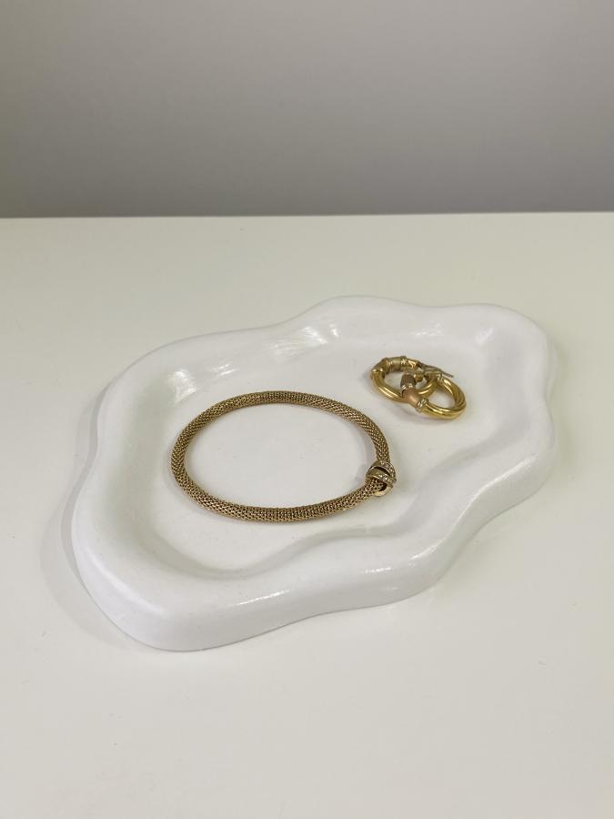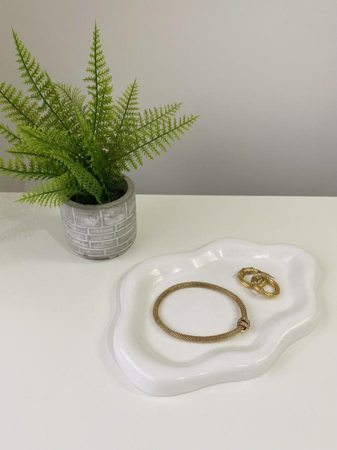 Forma orgánica y tendencia. Medidas: 19cm largo x13 cm ancho x 1.5cm Alto. Material: Yeso/Cemento. La base perfecta para tus velas y joyas ☁️