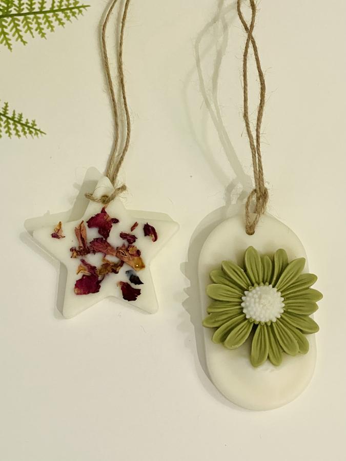 Perfumadores distintos diseños, uno con flores secas picadas y otro con una margarita de cera aplicada. Medidas estrella: 7cm largo x 0.5 alto. Medidas margarita: 9cm x 5cm x 2cm.Material: Soja y flores. Texturas naturales que perfuman 🌼🍃