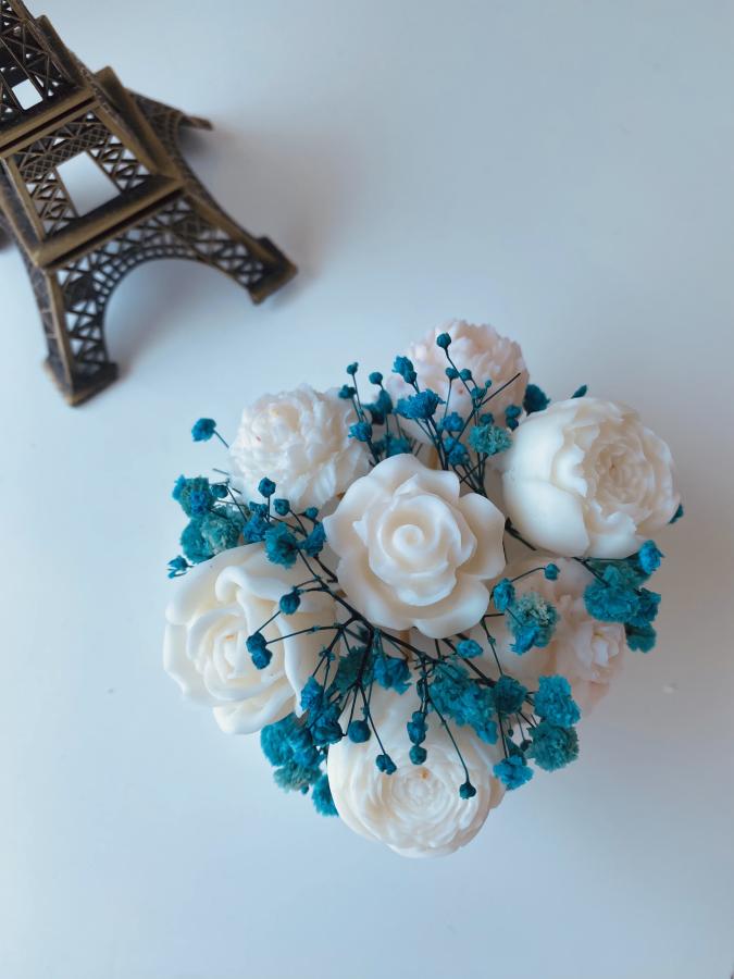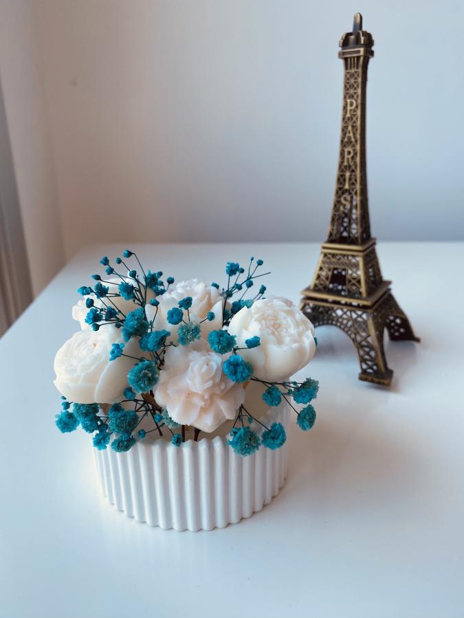 Un espectáculo floral sobre nuestra base artesanal. Incluye un ramillete de aprox. 7 flores de cera de soja modeladas a mano. Diseño de alto impacto y aroma envolvente. Material: Yeso/Cemento. Medidas: 10x8 cm 🌸✨