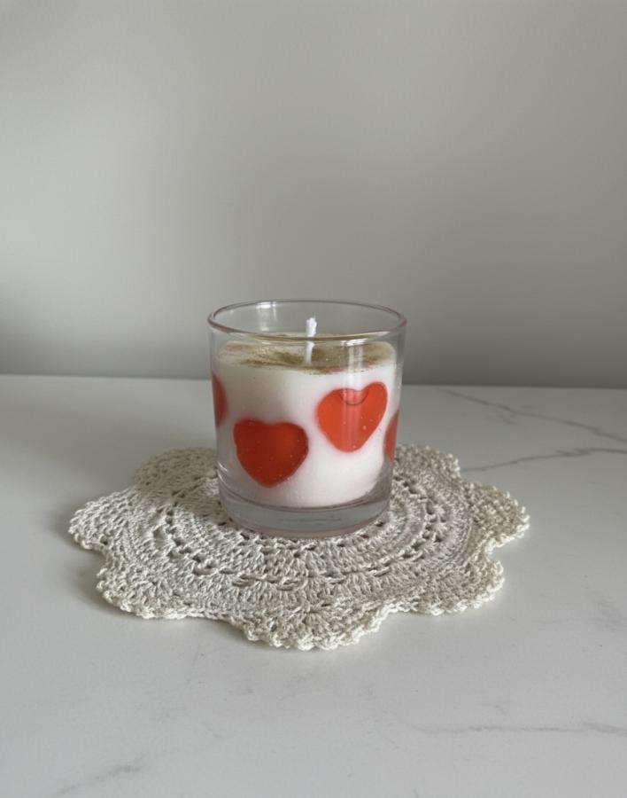 Diseño innovador con corazones de gel que parecen flotar en las paredes del vidrio. Hecha con cera de soja y cera gel. Una pieza única para iluminar con amor tus espacios. ✨❤️